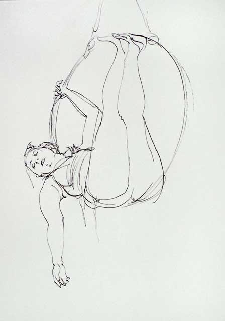 The mix of trying to set down performer, ropes, costume in such short time spans is a real stretch. I wrestle a lot with using black pens; while I am working they seem like such blunt, uncompromising instruments, and the drawing is a struggle, but afterwards I find I am much more okay with them than while in progress. I caught myself thinking while working on the top study, "whew - all I have to do here is an upside-down foreshortened body- no problem". Things are relative that way.